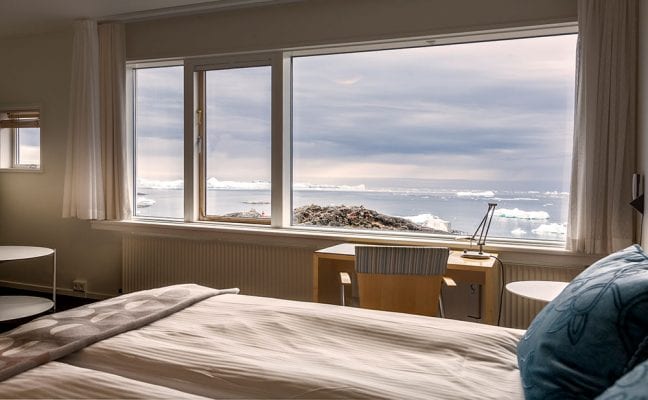Greenland’s best and most famous hotel is Hotel Arctic in Ilulissat. It has a fantastic view over the town of Ilulissat, its Icefjord and Disko Bay. Hotel Arctic is the world’s most northern 4-star hotel. Moreover, a 5-star conference center is available on site should you need it.