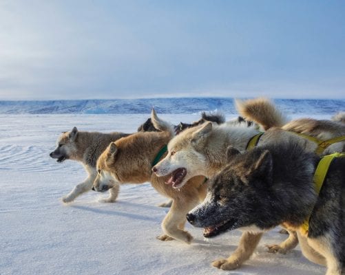 The temperature can rise by more than 10 degrees in the course of the night. A breeze is coming up from the south. It brings tight snow and low visibility. Now is the time for seal skin jackets with fur collars! During the 15 kilometres back over the Sikuiuitsoq Fjord we can see the glimpse of the catchers’ sleds, but mainly we only have a view of the 17 dogs that trot ahead, seemingly unimpressed by the weather.