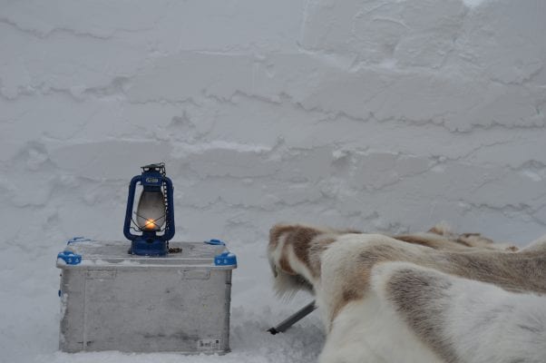 The Igloo Lodge consists of five spacious igloos, each with room for two people. Reindeer skin and warm winter sleeping bags are available. There are candles on the bedside table, which means that the temperature is around the freezing point inside the cabin. It stands in stark contrast to minus 20 degrees Celcius outside. The heated wooden cabin next to the igloos is where we eat our meals. In the wooden cabin, there is also a dry closet.